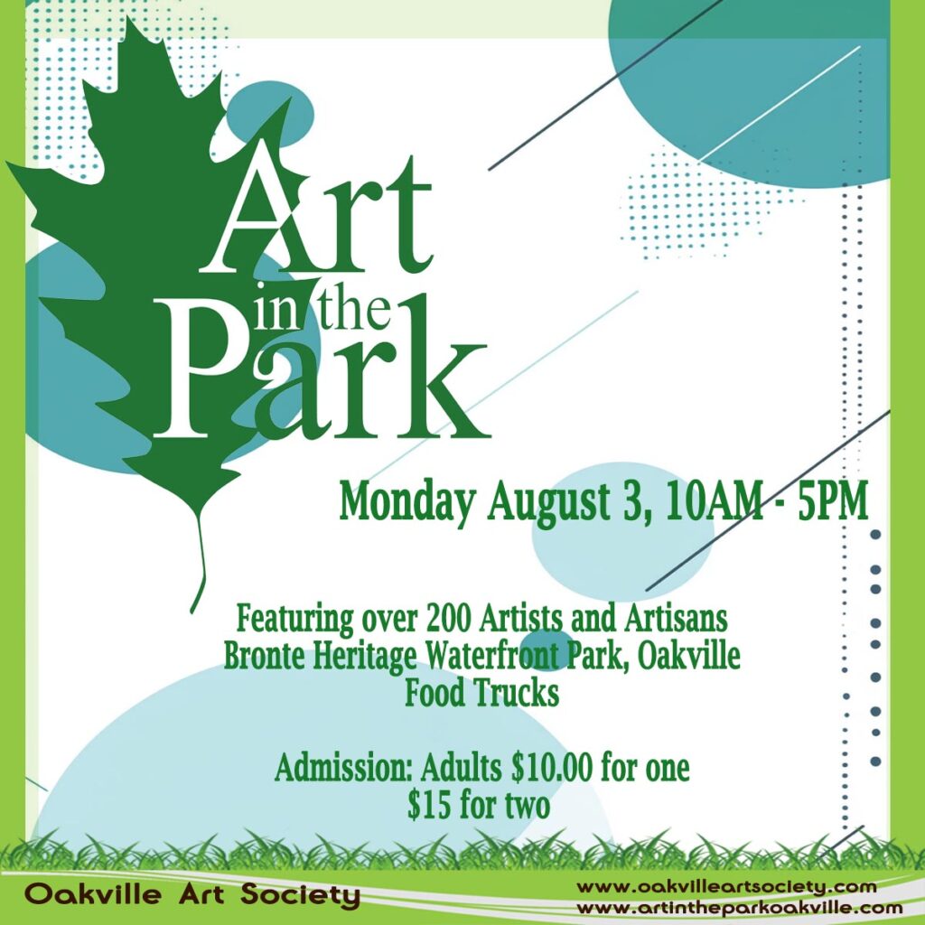 Art in the Park is back Monday, August 3, 2026 from 10AM to 5PM! The event will feature more than 180 artists and artisans from across Canada. Every medium will be represented, from traditional oil, acrylic and watercolor paintings to glass, ceramics, photography, mixed media, sculptures and fine jewellery.